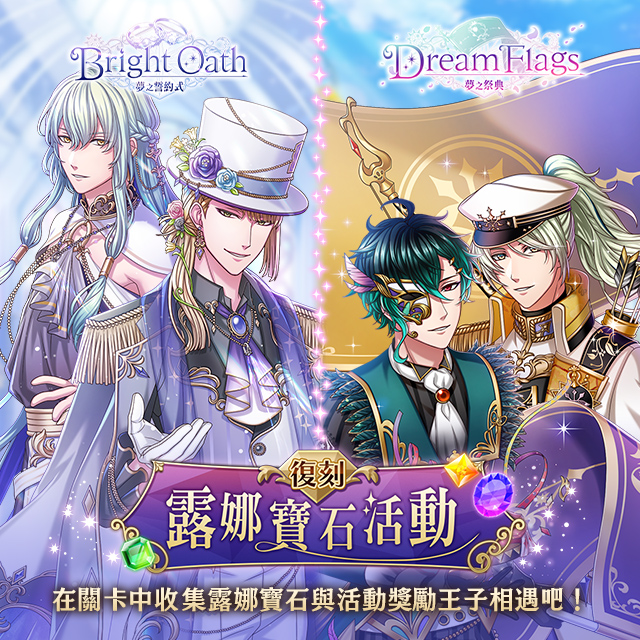 進行《-復刻-露娜寶石活動》任務關卡,將獲得隨機露娜寶石,收集露娜寶石達指定數量後,可於【露娜寶石交換所】中交換過去活動的獎勵王子,以及各項豪華獎勵。