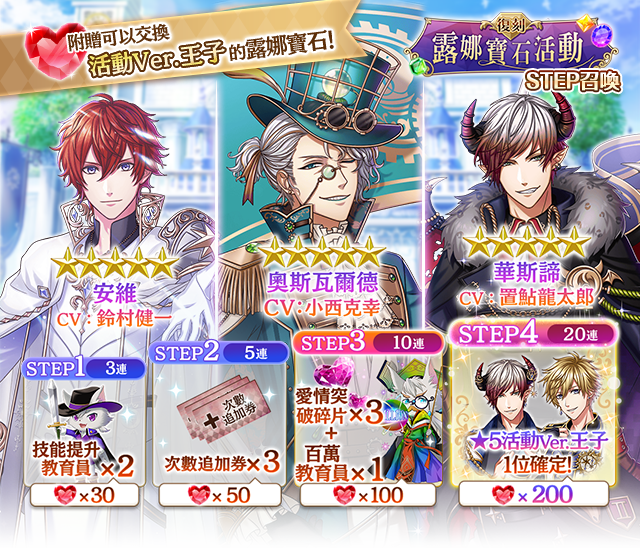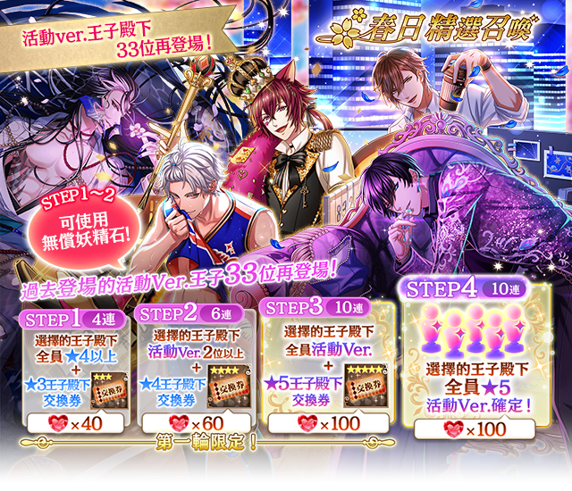 本次將開放STEP王子召喚,本次召喚將可進行三輪,第一輪使用有償、無償妖精石皆可,第二輪開始限定使用有償妖精石進行4 STEP召喚,將可獲得額外特典唷!