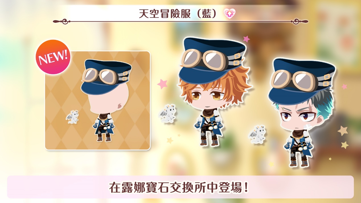 本次花束寶石交換所中包含了小屋衣裝「天空冒險服(藍)」,將會轉換為小屋衣櫃中王子可穿戴的衣裝喔。