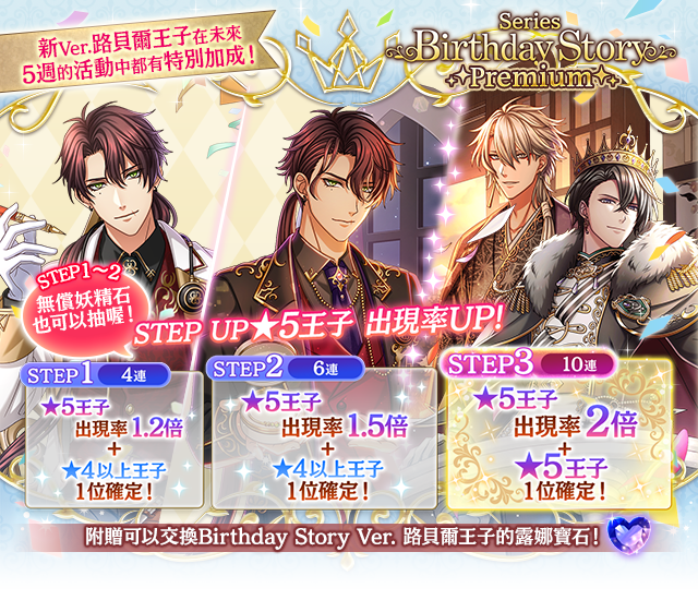 本次將開放Birthday Story Premium STEP王子召喚,本次召喚可進行3輪,每一輪3次的STEP召喚,Step 1 ~ 2 可使用無償妖精石,Step 3限定使用有償妖精石進行。