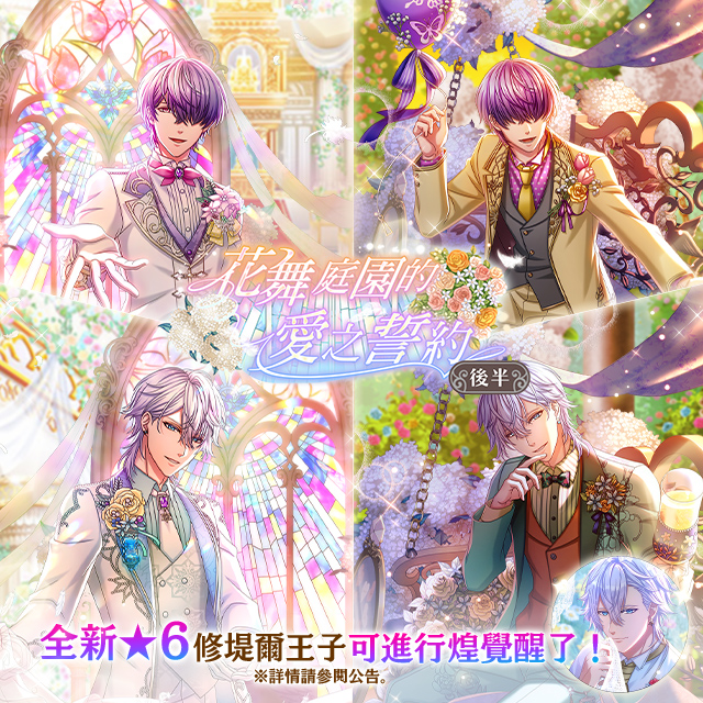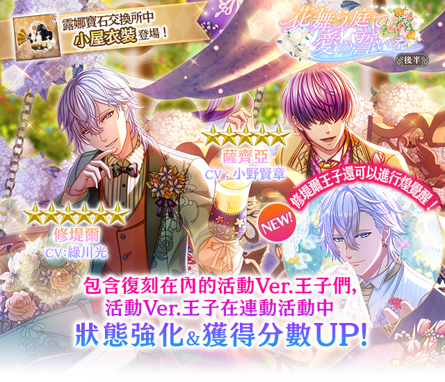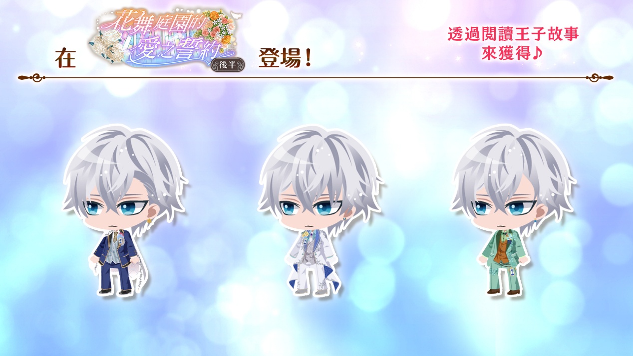 活動期間進行【花舞庭園的愛之誓約 後半】活動任務,即可獲得活動限定活動點數。累積獲得活動點數,即可獲得活動限定王子,以及豪華獎勵。
