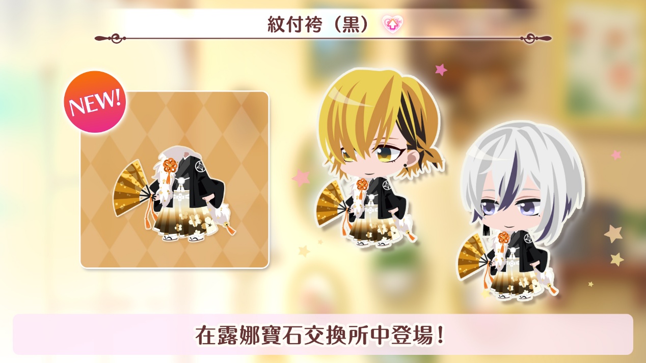 本次花舞後半寶石交換所中包含了小屋衣裝「紋付袴(黒)」,將會轉換為小屋衣櫃中王子可穿戴的衣裝喔。
