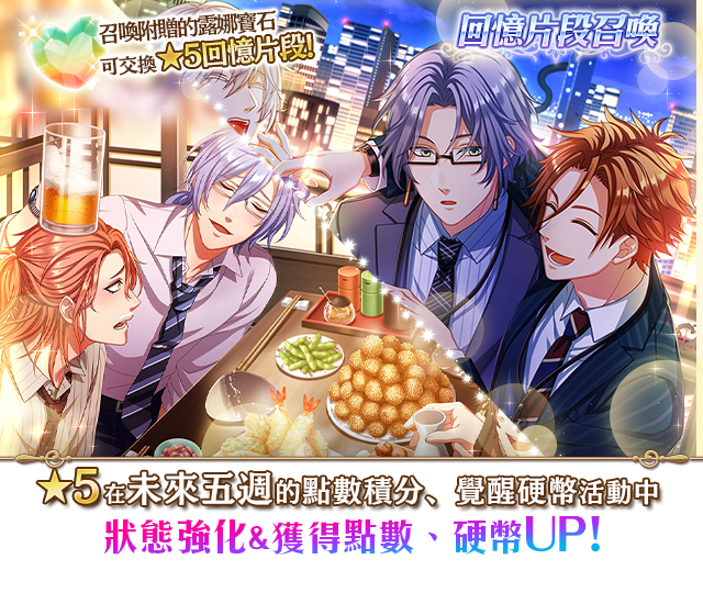 ★5回憶片段,將在未來四週的活動點數、覺醒硬幣活動中附有加成效果喔!並且在本次的回憶片段召喚中,出現機率加倍!