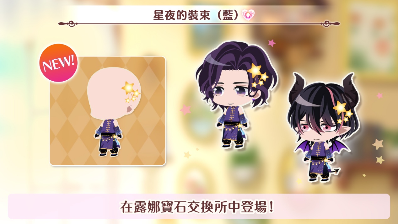 本次螢火前半露娜寶石交換所中包含了小屋衣裝「星夜的裝束(藍)」,將會轉換為小屋衣櫃中王子可穿戴的衣裝喔。