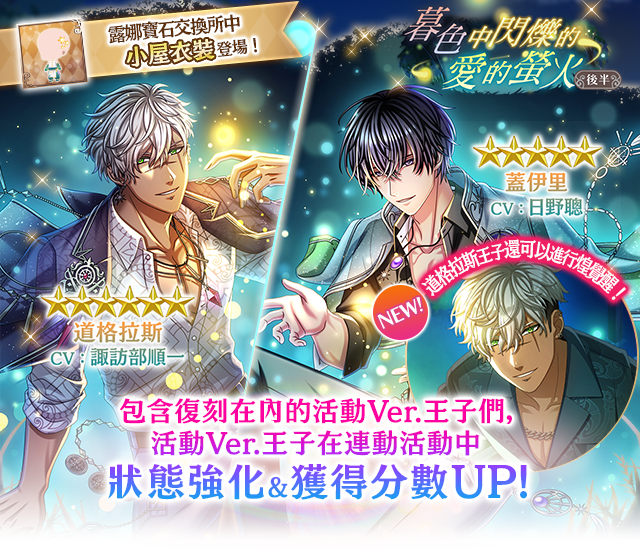 活動期間進行【暮色中閃爍的愛的螢火 後半】活動任務,即可獲得活動限定活動點數。累積獲得活動點數,即可獲得活動限定王子,以及豪華獎勵。