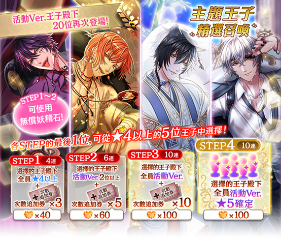 本次將開放主題王子 STEP精選召喚,本次召喚可進行3輪,每一輪4次的STEP召喚,Step 1 ~ 2 可使用無償妖精石,Step 3~4限定使用有償妖精石進行。